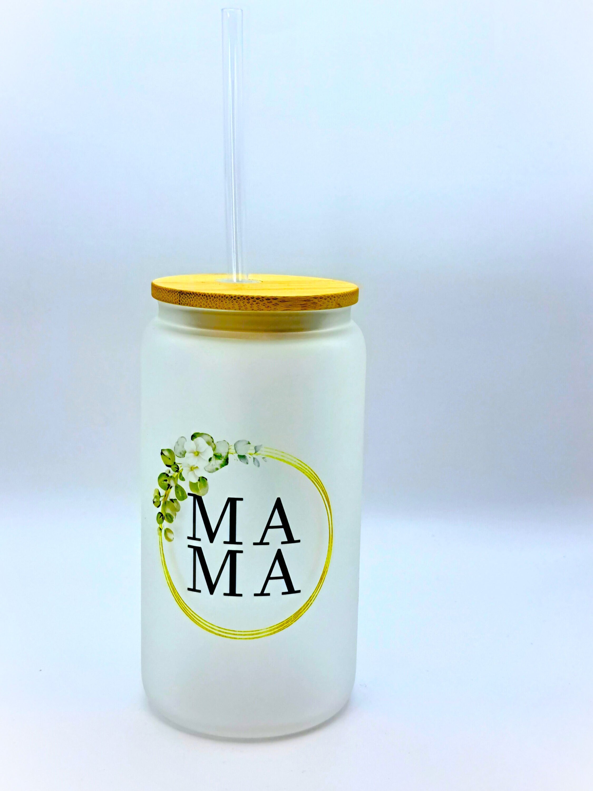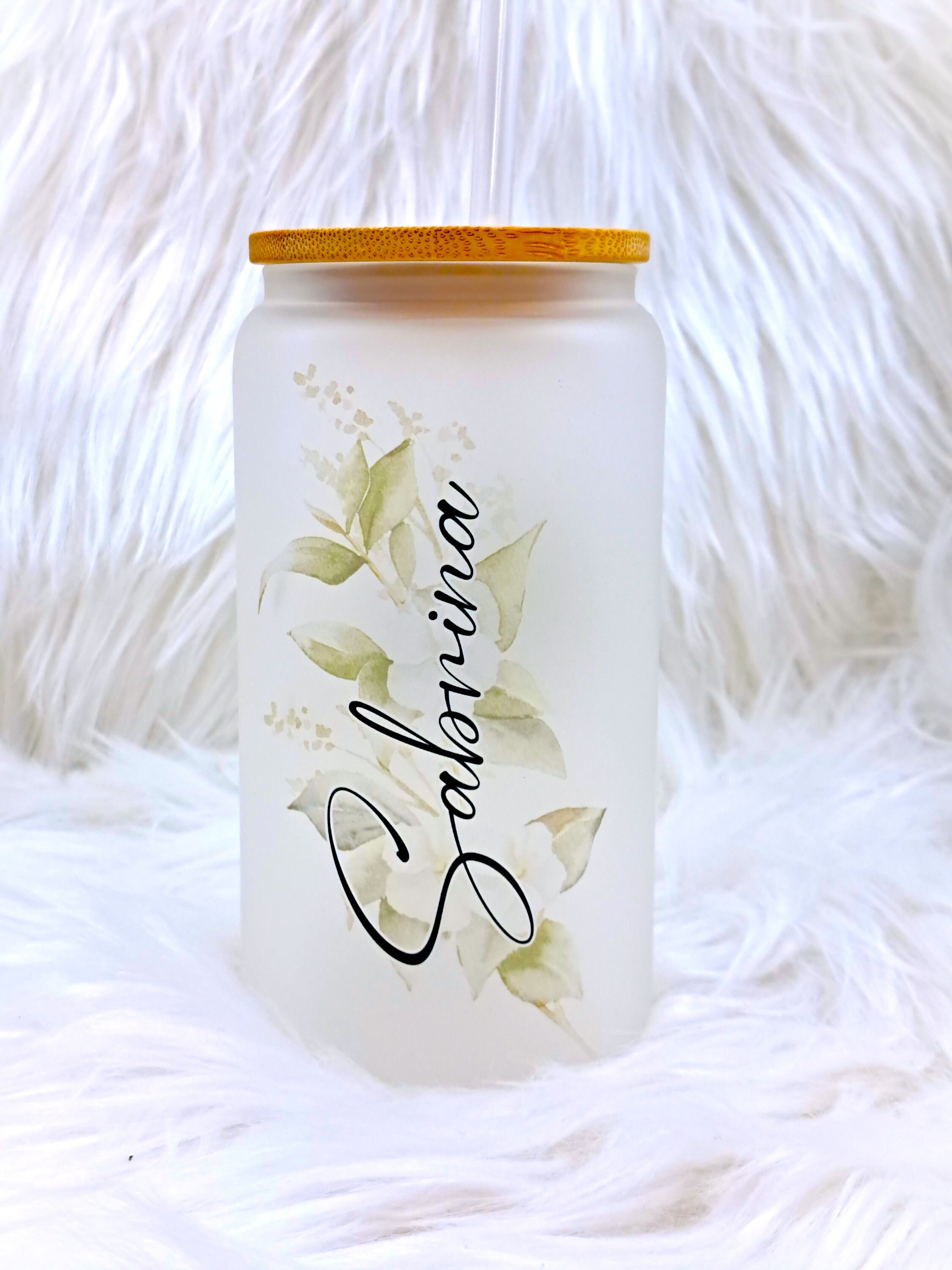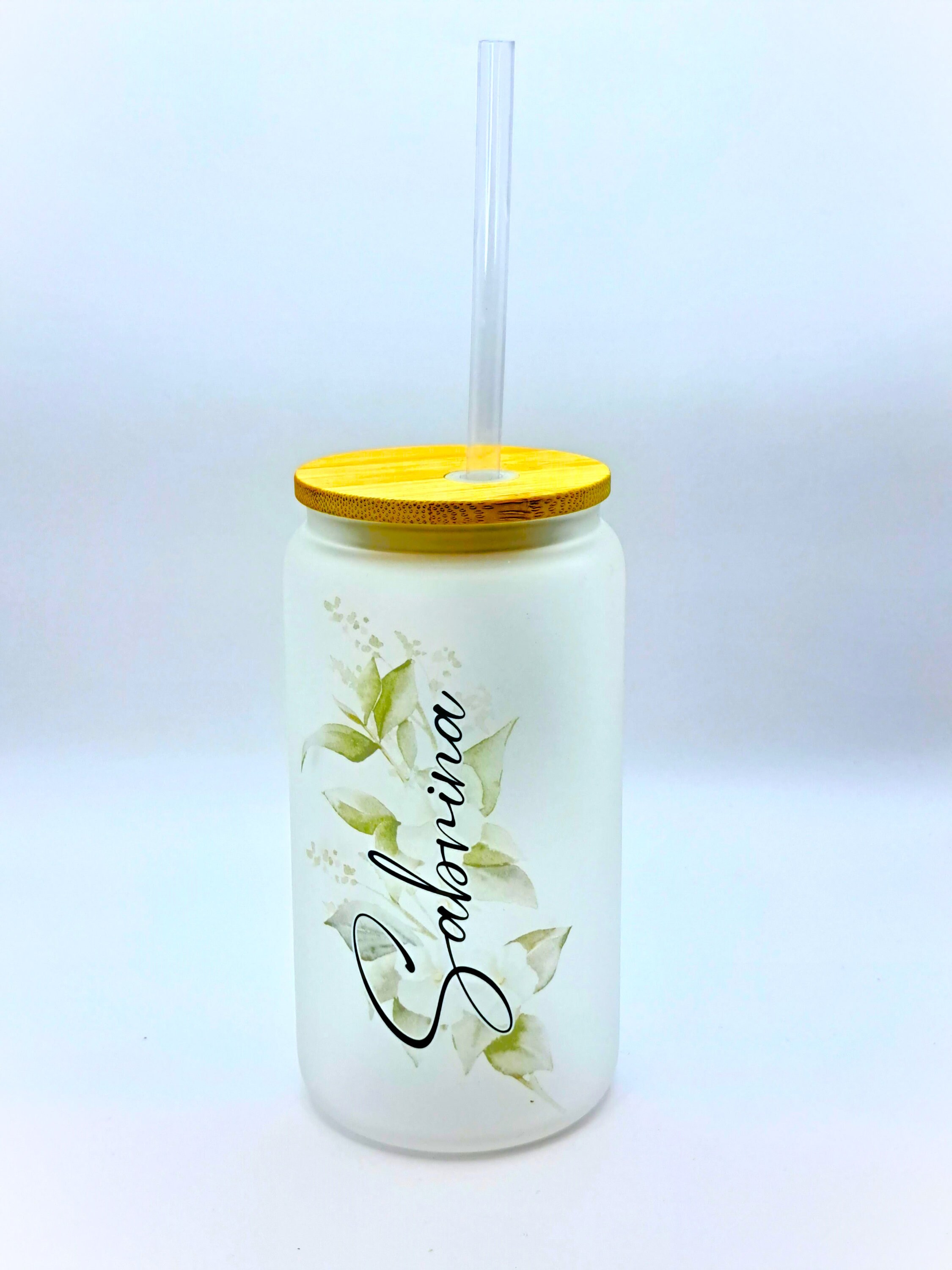 This personalized 470ml frosted glass comes with a beautiful light brown bamboo lid and a clear reusable plastic drinking straw. The bamboo lid has a rubber ring for sealing, which ensures a firm hold and leak protection.