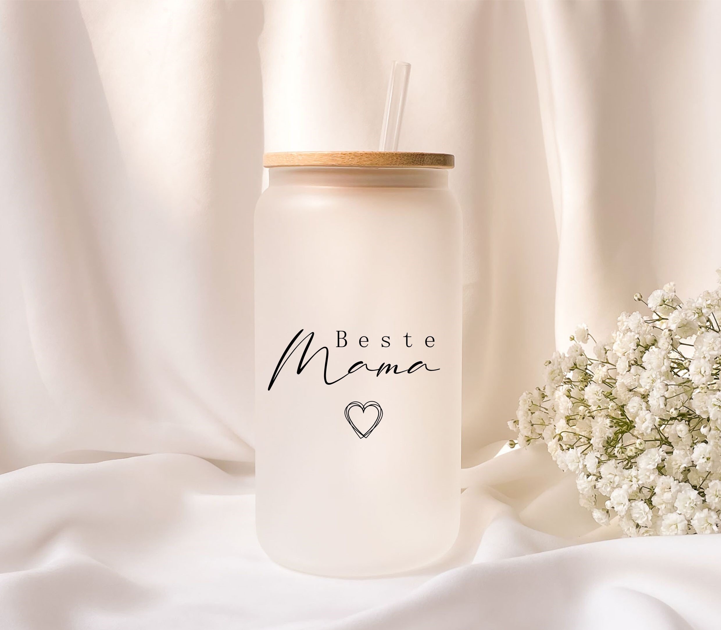This unique frosted glass with a capacity of 470 ml comes with a beautiful light brown bamboo lid and a transparent reusable plastic drinking straw. The bamboo lid is provided with a rubber ring for sealing, which ensures a firm hold and protection against leaks.