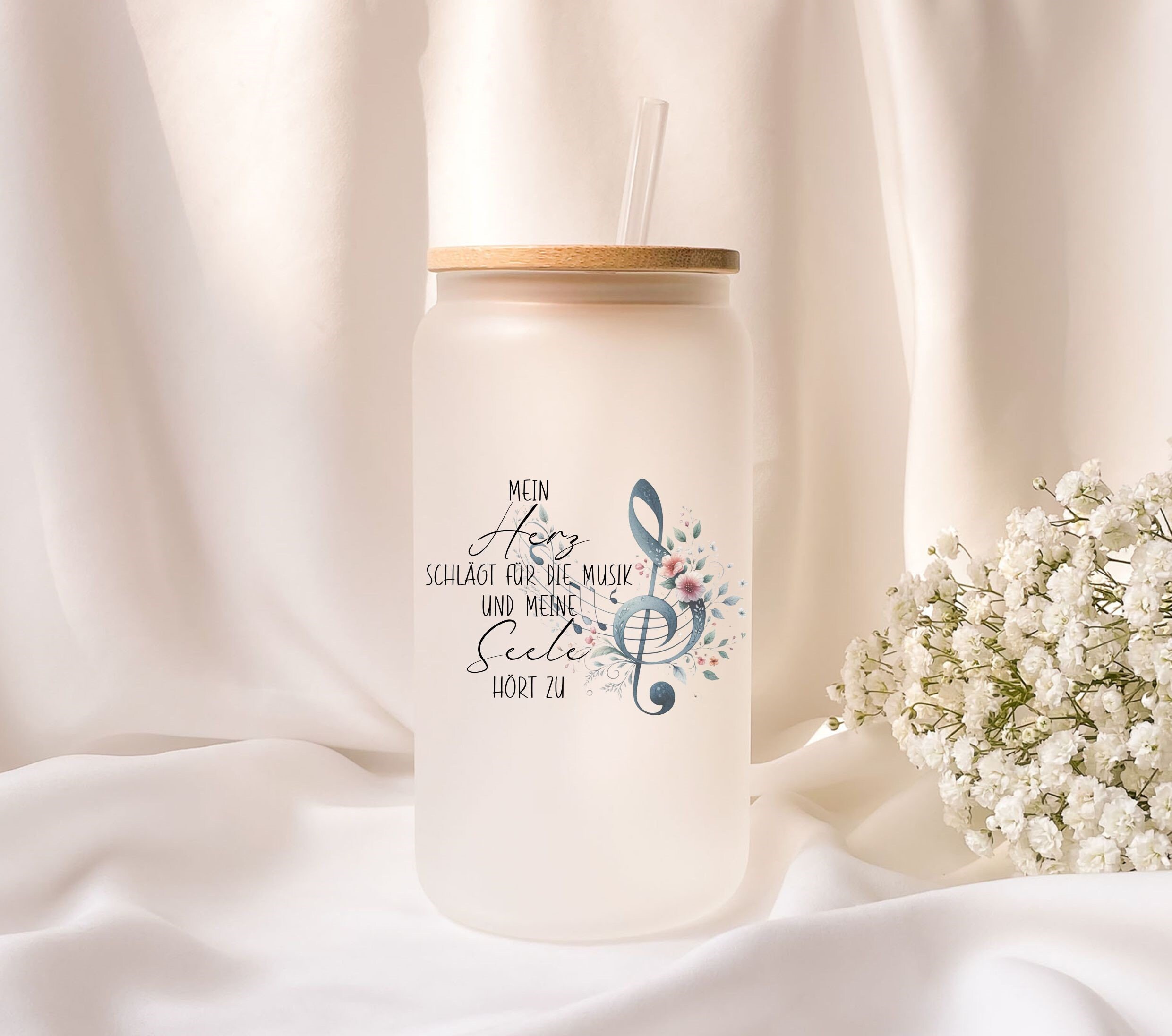 This unique frosted glass with a capacity of 470 ml comes with a beautiful light brown bamboo lid and a transparent reusable plastic drinking straw. The bamboo lid is provided with a rubber ring for sealing, which ensures a firm hold and protection against leaks.