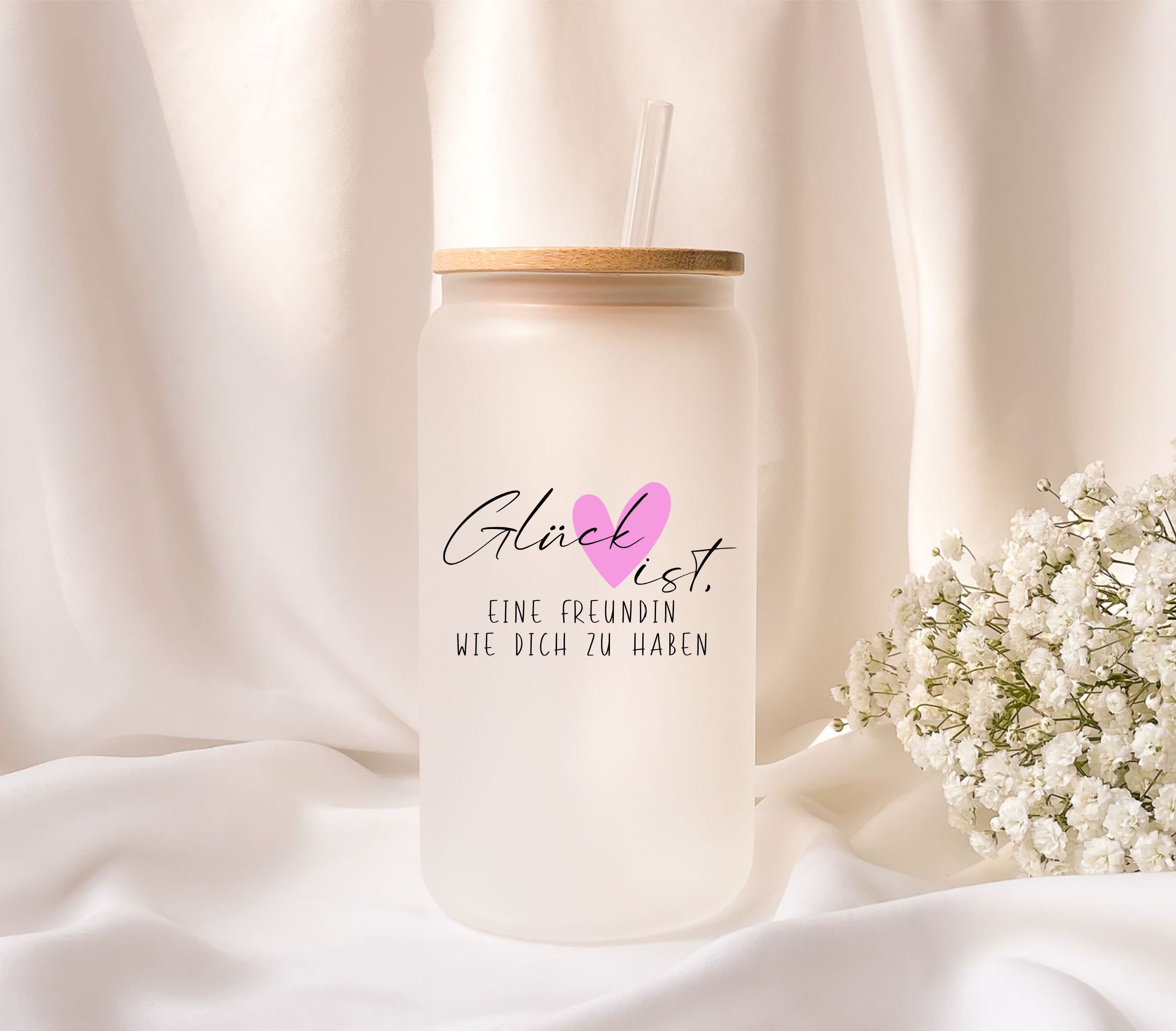 This unique frosted glass with a capacity of 470 ml comes with a beautiful light brown bamboo lid and a transparent reusable plastic drinking straw. The bamboo lid is provided with a rubber ring for sealing, which ensures a firm hold and protection against leaks.