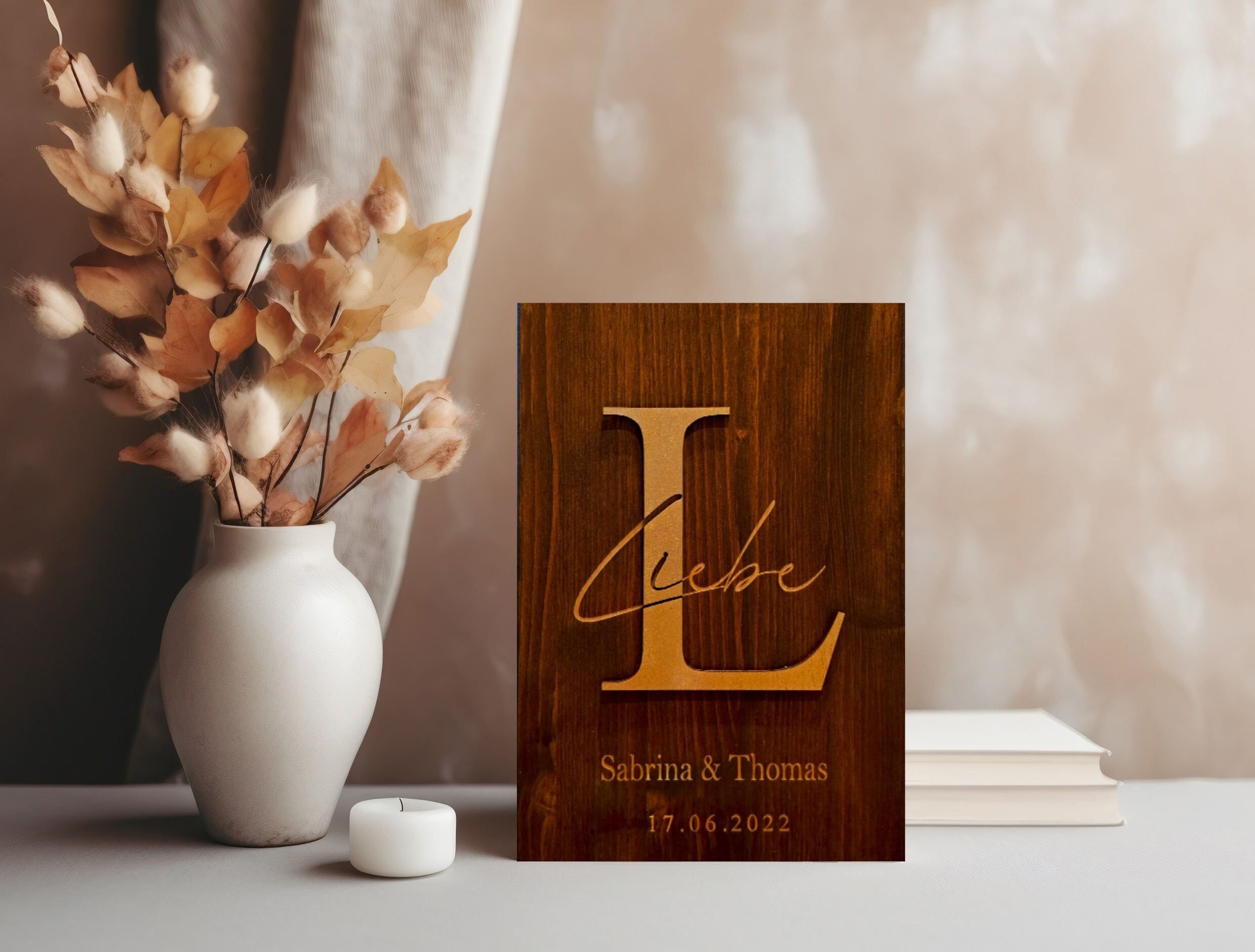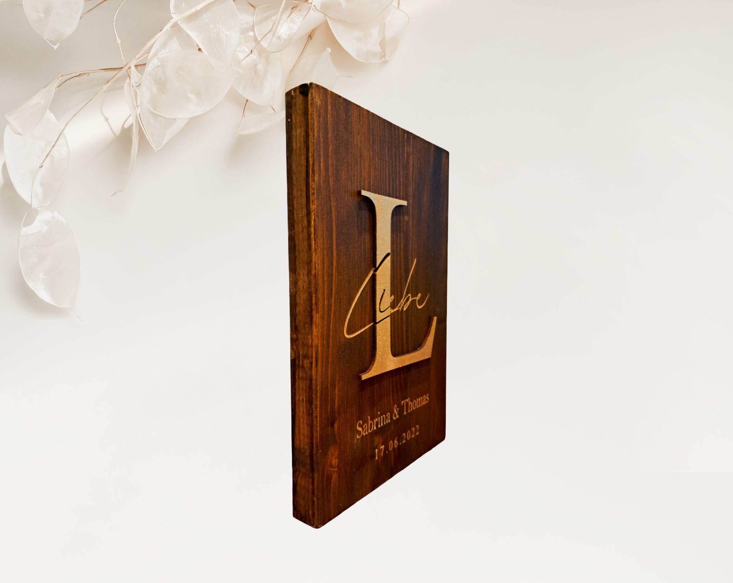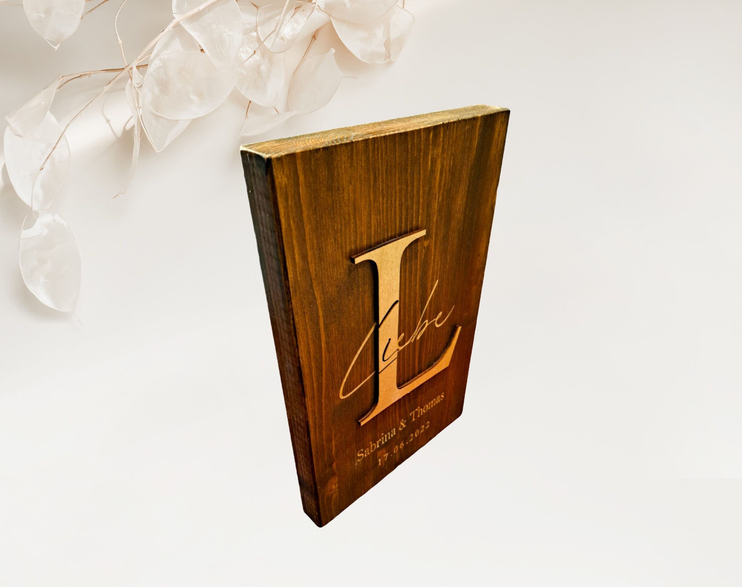 Whether as a wedding gift on the gift table or as decoration at home on the shelf or on the wall, this beautiful decorative wooden sign is an absolute eye-catcher and something very special for two special people. Thanks to its optimal thickness, the sign can be easily placed anywhere. The "L" stands out in a beautiful 3D look on the sign, which creates an elegant look. The word "love" and the personalizations are given their special touch by a careful engraving in the wood. Choose between different colors and customize your sign perfectly for you.