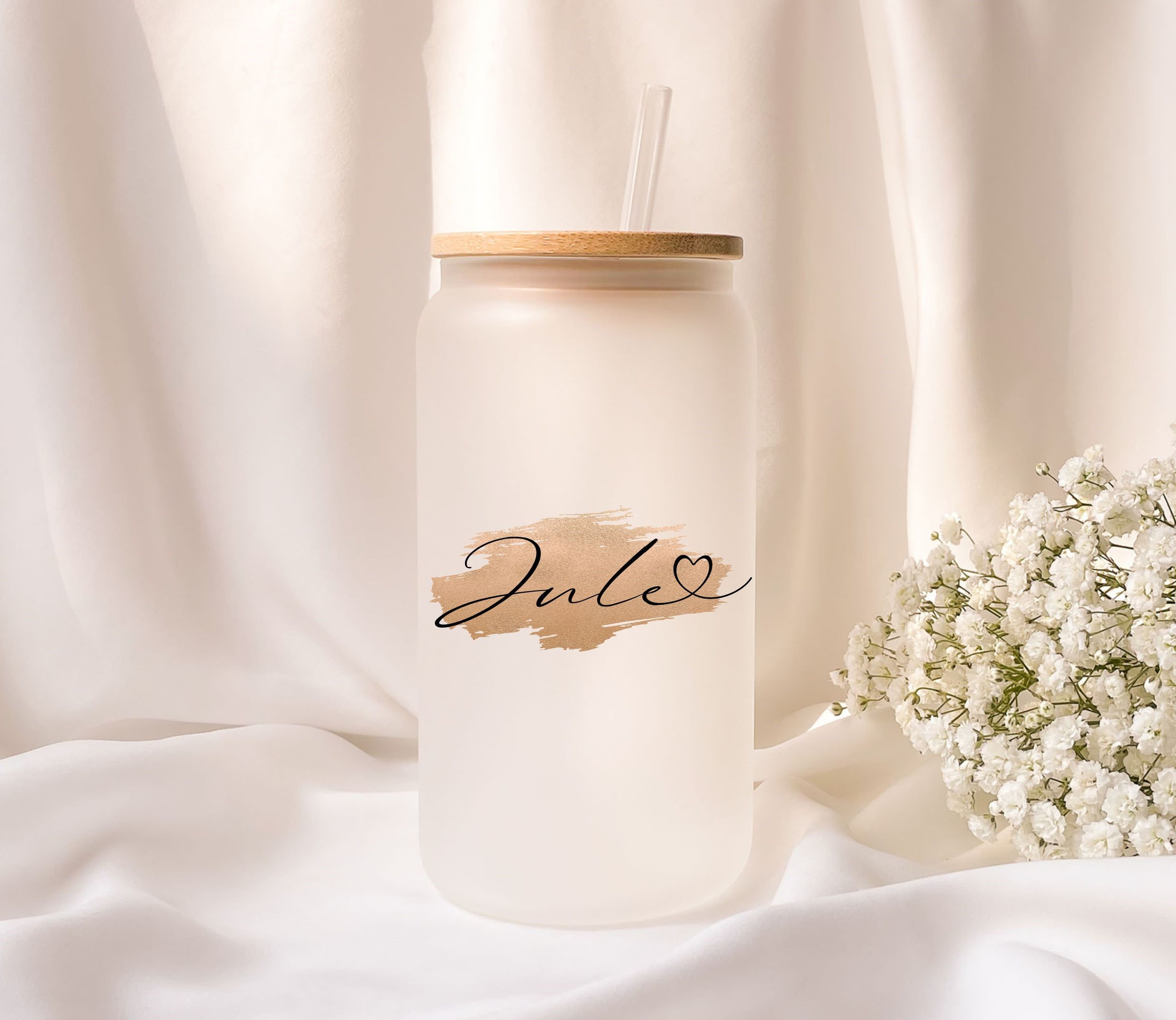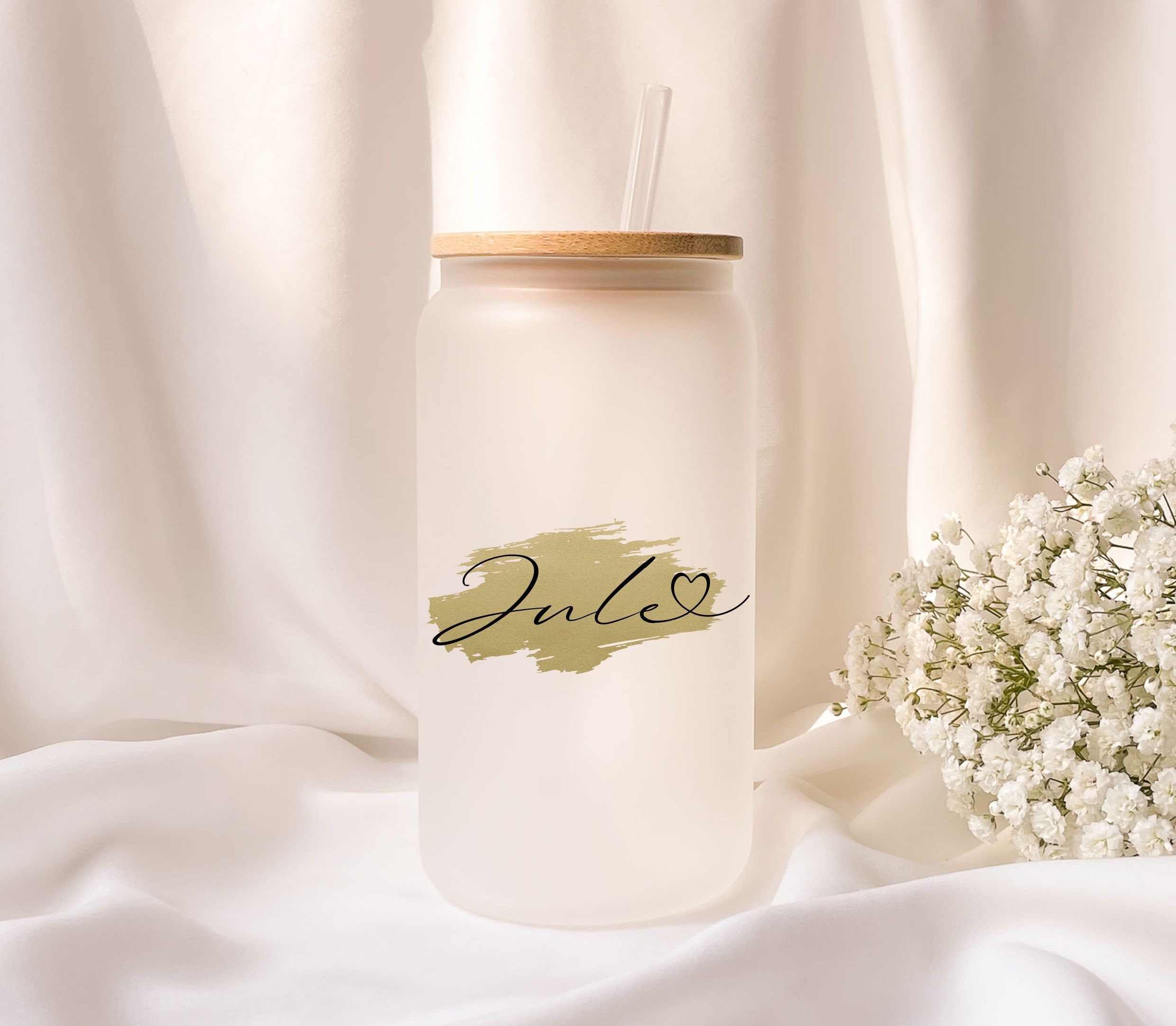Frosted glass with bamboo lid, personalized