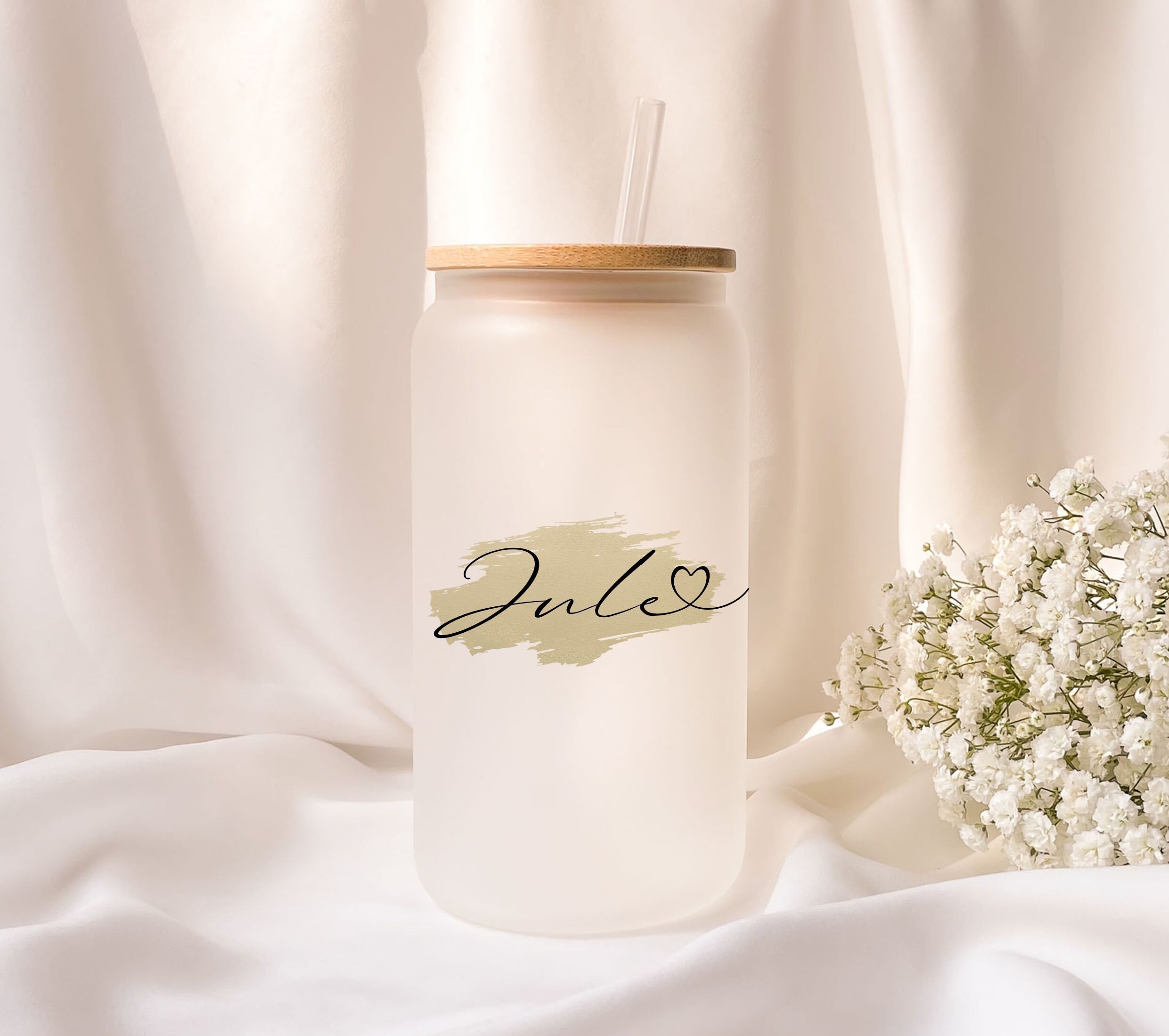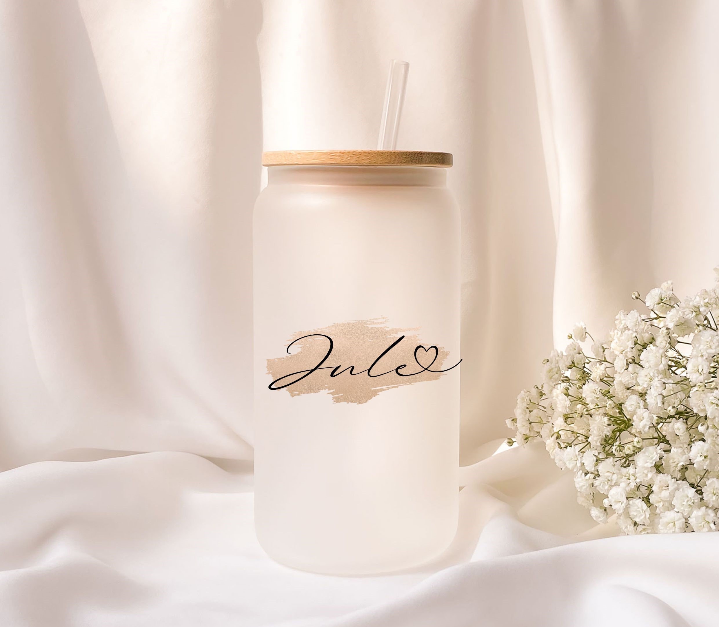 Frosted glass with bamboo lid, personalized