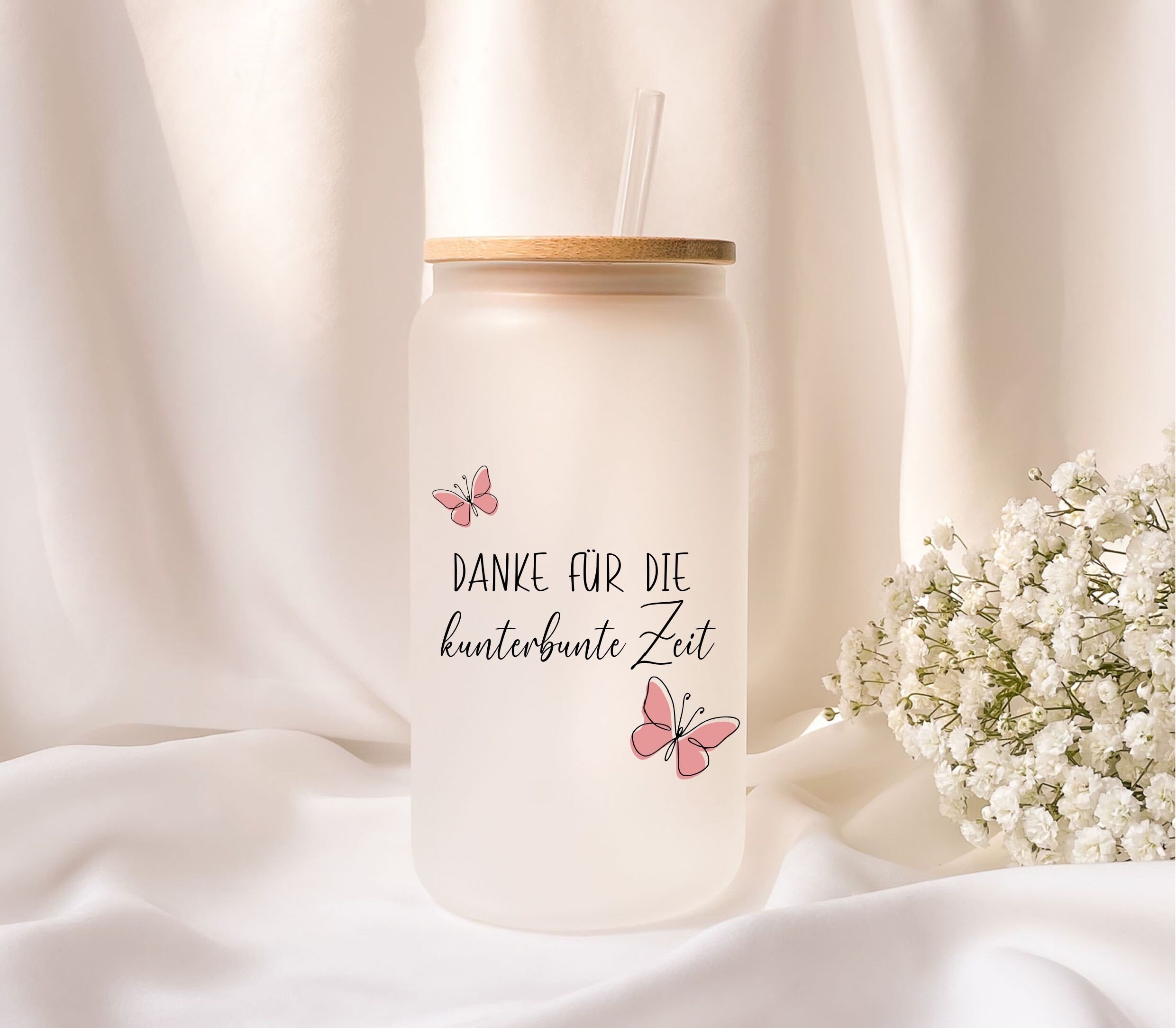 This unique frosted glass with a capacity of 470 ml comes with a beautiful light brown bamboo lid and a transparent reusable plastic drinking straw. The bamboo lid is provided with a rubber ring for sealing, which ensures a firm hold and protection against leaks.