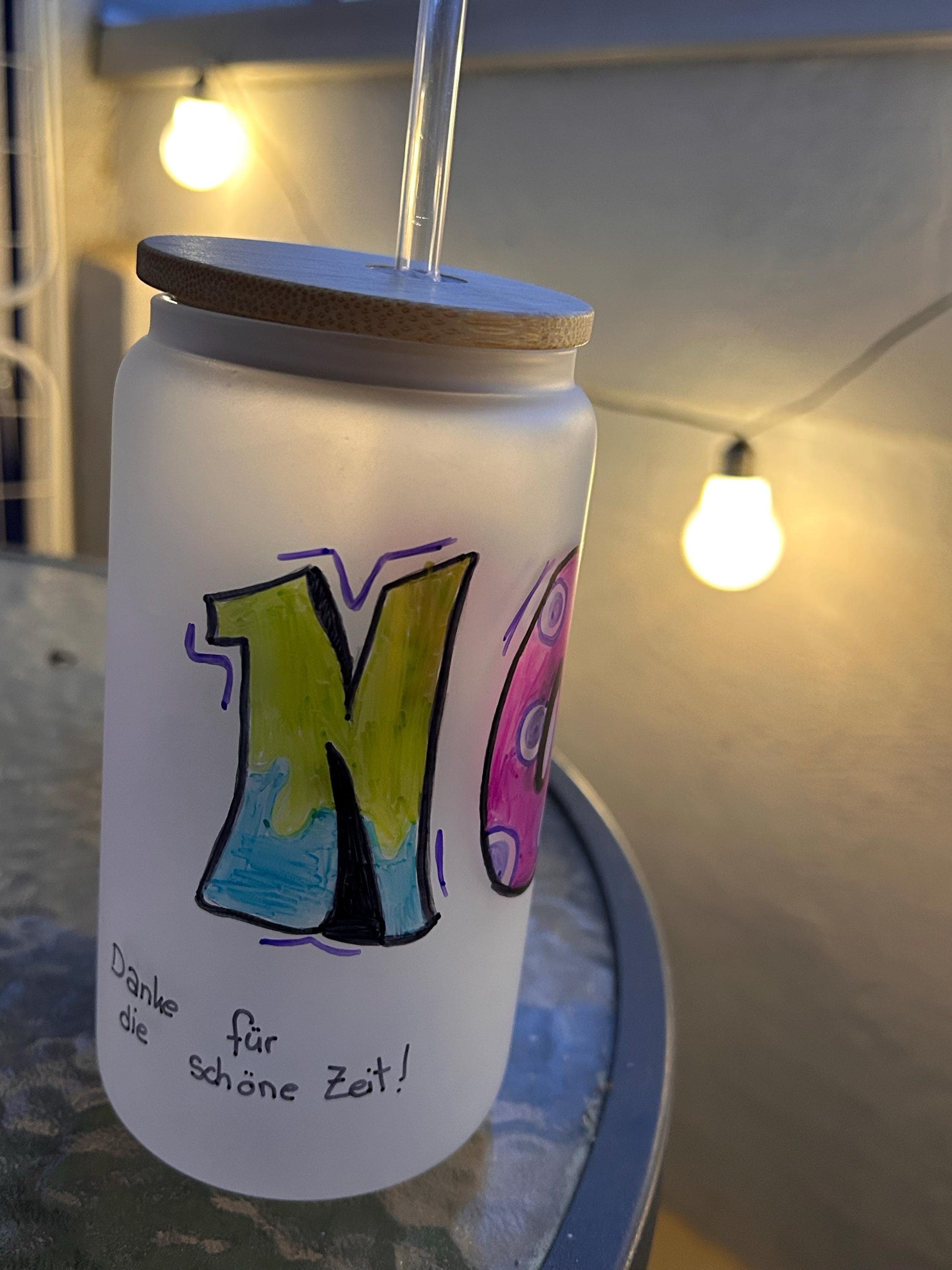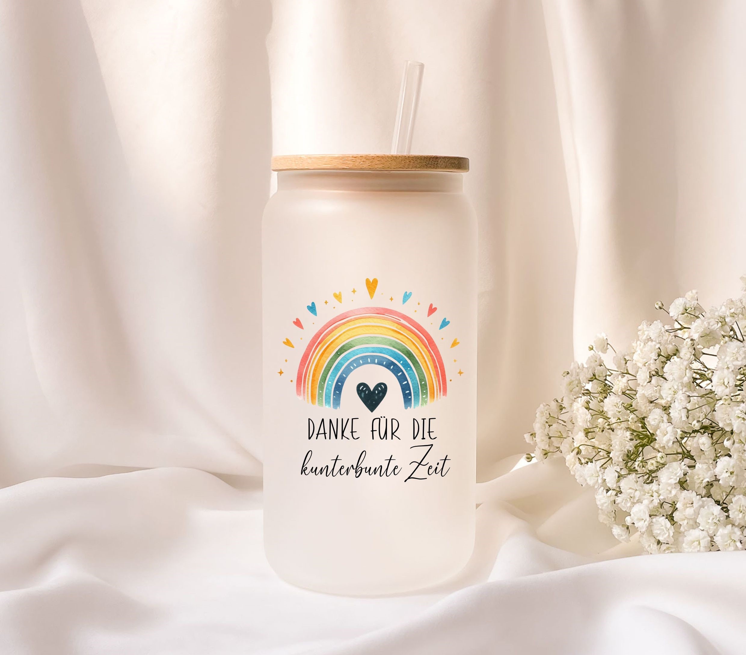 Frosted glass with bamboo lid, personalized for the educator with heart