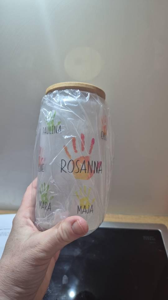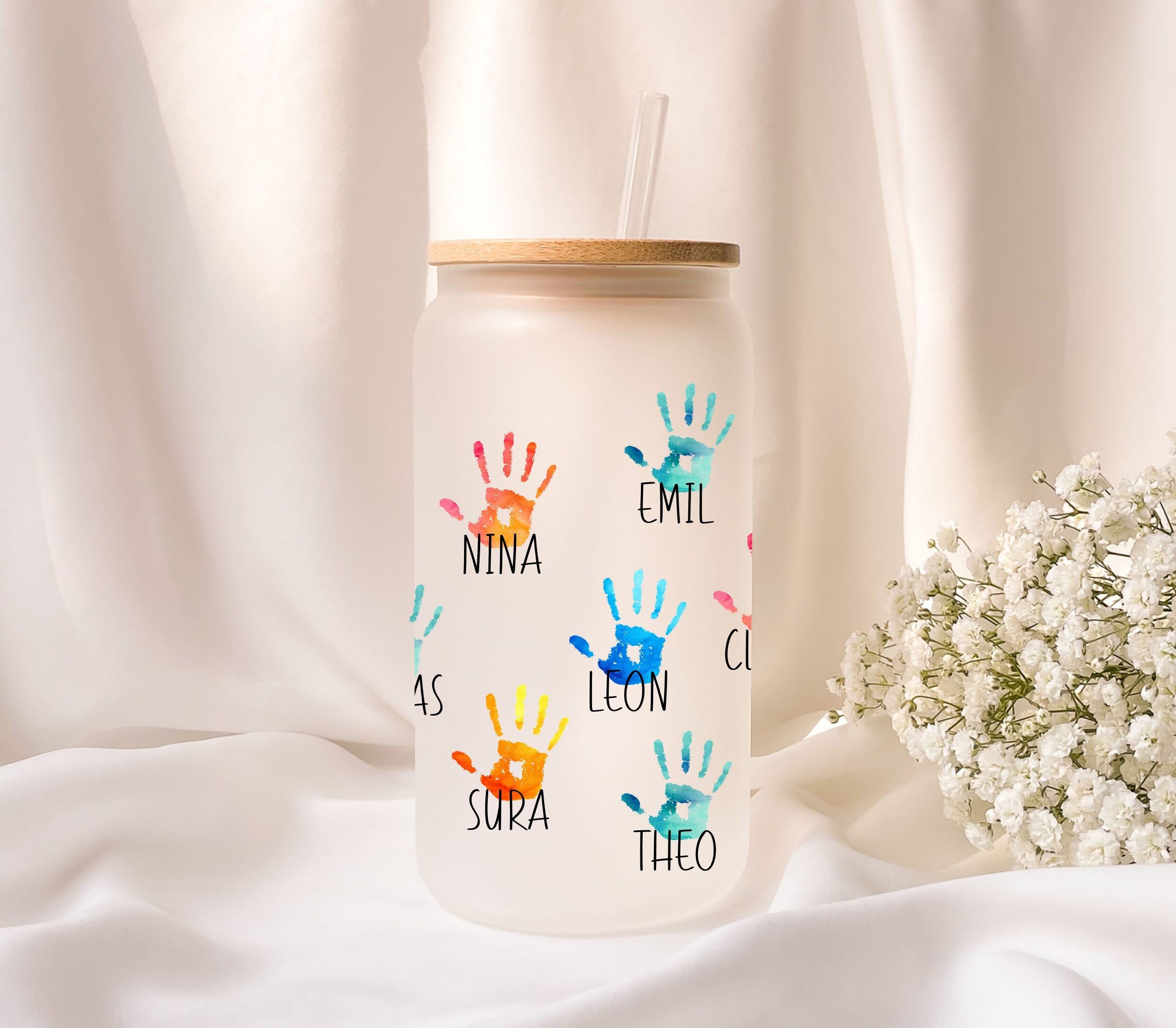 Frosted glass with bamboo lid, personalized