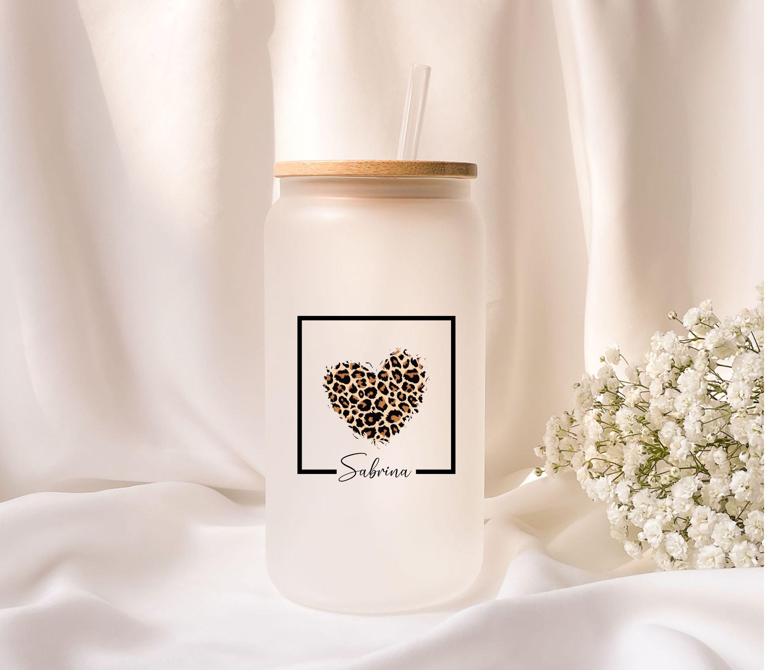 Iced coffee glass | Heart | Leopard print | Frosted glass | Gift | Personalized - ToGo - Vacation - Summer - Cocktail